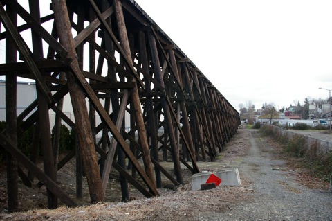 Hout wordt veelvuldig gebruikt als bouwmateriaal. Behalve huizen ook voor spoorwegviaducten. Hier rijden dag en nacht lange Amtrak goederentreinen over.