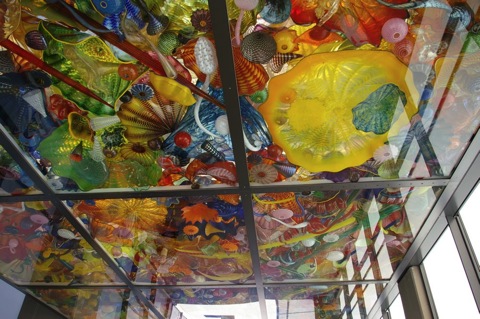 De brug tussen het centrum en het wereldberoemde glasmuseum is gedeeltelijk overkapt met horizontale vitrines, waarin het werk van Dale Chihuly valt te herkennen.