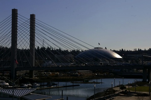 The Tacoma Dome can be seen from most parts of the town. Left of the Dome the Tacoma Dome Best Western Hotel is visible.