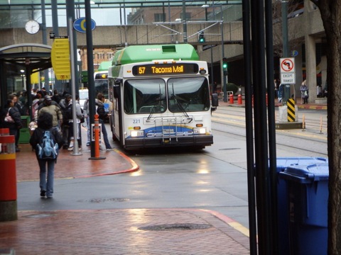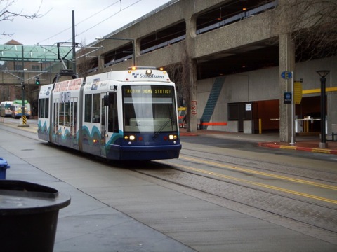 Tussen Tacoma Dome Station en het centrum (Theater District) van Tacoma rijdt om de 10 minuten (overdag) de Tacoma Link, een gratis trammetje dat zich met veel bellen en (blauwe) flitslampen een weg door de stad baant.