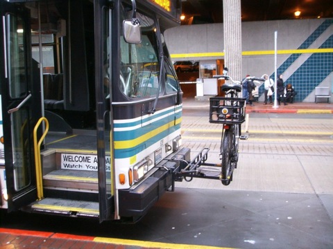 Elke bus heeft een fietsendrager vóórop. De passagier zet er zelf zijn fiets op.