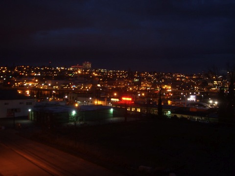 We komen aan in het Tacoma Dome Best Western Hotel nà zonsondergang. Dit is het uitzicht vanuit onze kamer.