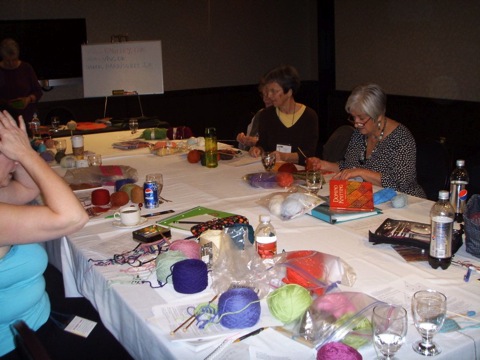 In het Murano Hotel, ook al volop gedecoreerd met glaskunst, wordt de Madrona Fiber Arts Retreat gehouden. Sylvia heeft zich ingeschreven voor een workshop van Vivian Høxbro. Op deze foto wat pakketten van Vivian d’r creaties.